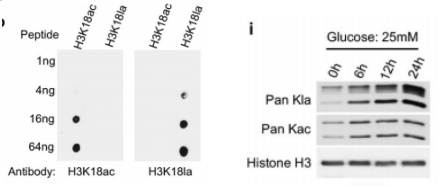 乳酸化修饰的抗体已经很成熟,有检测全部乳酸化修饰的(pan-Kla),也有检测特异性位点乳酸化修饰的抗体,例如anti-H3K18la, anti-H3K27la,H4K12la等。根据实验的精细程度,可以选择免疫斑点实验(左图)和WB实验(右图)。相比其它检测方法,这个方法步骤相对简单,对样本制备的要求相对低,特别适合需要考虑剂量效应和时间效应的课题。