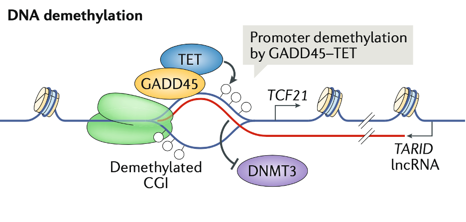 在部分含有 CpG 岛 (CGI)的启动子中,GADD45(growth arrest and DNA damage protein 45A)充当 R 环“reader”,招募DNA去甲基化酶TET(ten–eleven translocation),使启动子 DNA 去甲基化,激活转录。下图显示的是lncRNA TARID(TCF21 antisense RNA inducing demethylation)和顺式靶基因转录因子TCF21(gene transcription factor 21)。从富含R-loop的CGI去除DNMTs(DNA (cytosine-5)-methyltransferases),例如DNMT3,可能可以增强去甲基化的效果。