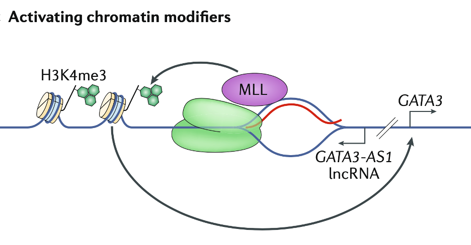 染色质修饰剂也可促进转录。例如甲基转移酶复合物MLL(mixed-lineage leukaemia)家族,被GATA3基因启动子区域的R-loop招募,通过H3K4me3促进转录。