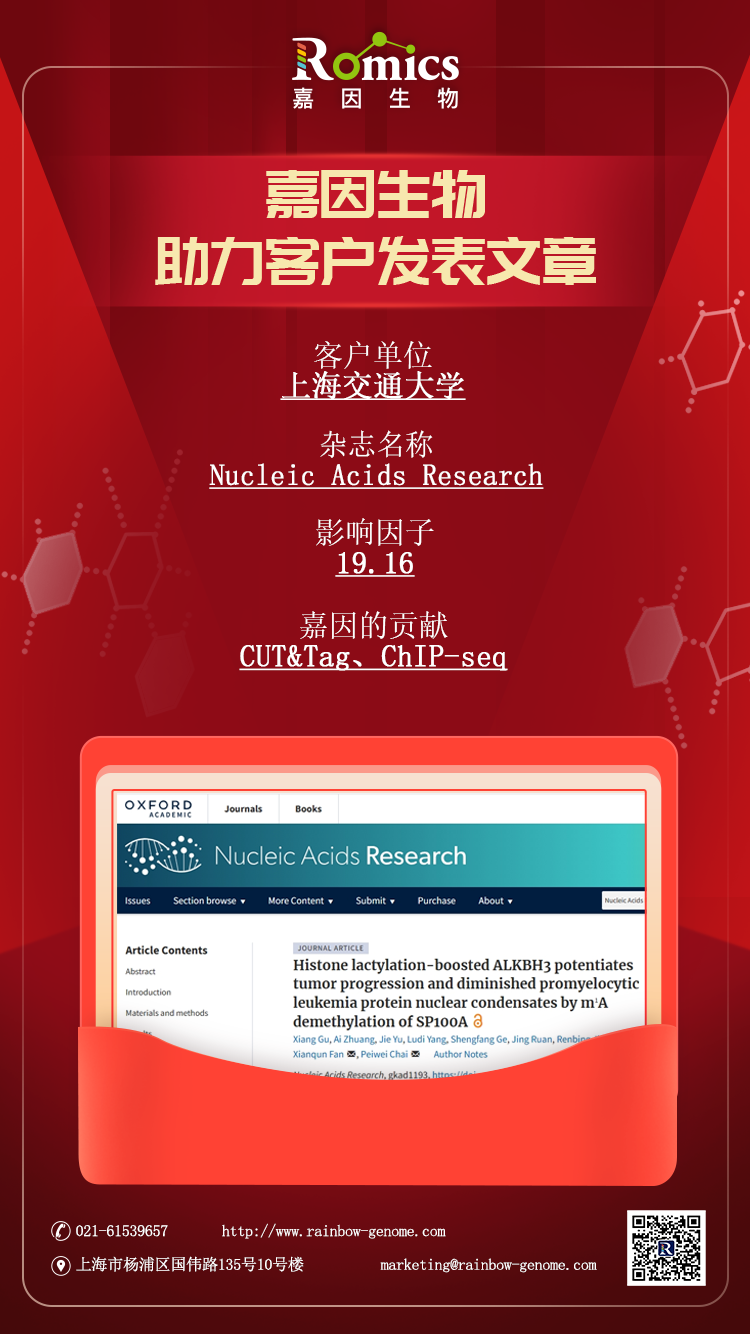 2023年12月,上海交通大学医学院附属第九人民医院范先群院士、贾仁兵教授、柴佩韦博士共同作为通讯作者在Nucleic Acids Research上发表学术论文“Histone lactylation-boosted ALKBH3 potentiates tumor progression and diminished promyelocytic leukemia protein nuclear condensates by m1A demethylation of SP100A”,利用CUT&Tag和ChIP-seq初步发现并验证了组蛋白乳酸化可以提高m1A去甲基化酶ALKBH3的表达,去除SP100A的m1A 甲基化并抑制其作为眼睛黑色素瘤肿瘤抑制因子的功能表达。文章结果**次表明m1A可以激活肿瘤抑制因子,以及组蛋白乳酸化、mRNA的m1A修饰和PML凝聚体形成之前的关联,为肿瘤的治疗提供了新的靶点和有效的治疗方案。